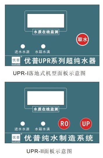 (6)輕按控制面板“RO”取水按鍵或“UP”取水按鍵,便可從主機取二級RO純水和UP超純水。(UPR-II機型)